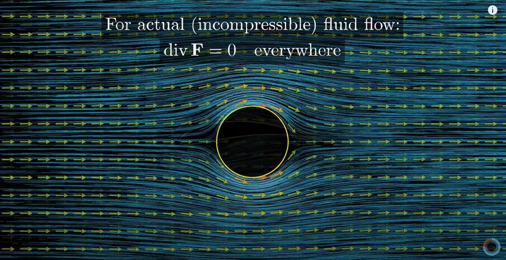 quote: “each vector in the field describes velocity of the fluid in that point – notice that when you do that the fluid behaves in a very strange nonphysical way. around some points, the fluid just seems to spring into existence from nothingness as if there’s some kind of source there.”
