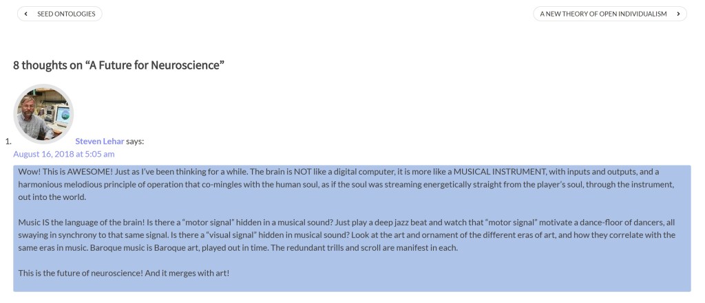 Comment section screenshot from A Future for Neuroscience (opentheory.net), a blogpost by Michael Johnson (author of Principia Qualia) analyzing significance of resonance.