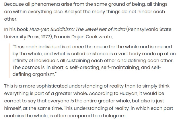 At each node of the net is a jewel so arranged that every jewel reflects all the other jewels. No jewel exists by itself independently of the rest. Everything is related to everything else and nothing is isolated. Hologram (from the Greek holo, holistic) means “entire picture“.